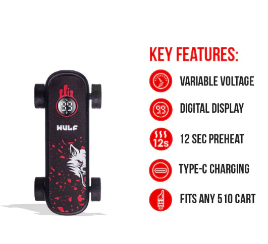 Cruise into your fade with our WULF 510 Thread Skateboard battery! Digital Display & USB-C! Variable Voltage: (2.4, 2.8, 3.2, 3.6, 4.0v). Pre Heat: 12 seconds. Battery Capacity: 500mAh.